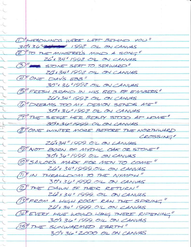 Despite the vague depictions of otherworldly scenes, I had chosen lines from The Odyssey to identify each. I might have already considered my work illustration, not fine art. More recently, I came across the original, hand-written rough draft of a sheet of details for the show: